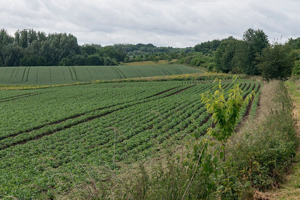 Landgraaf Die Niederlande Sanft gewellte Landschaft mit Kartoffelfeldern in der Limburger Landschaft. Landschaft, Landschaft, Landwirtschaft, Kartoffeln, Solanum tuberosum, Hügel, hügelig, Fußweg, Wandern,