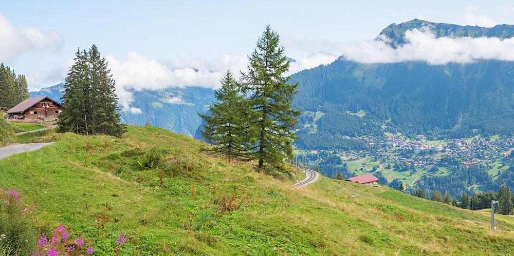 Wanderweg von Mürren zur Grütschalp. Landschaft im Berner Oberland, Schweizer Alpen