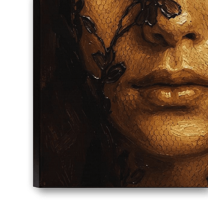 Bestelle diese Malerei Warm strukturiertes Ölporträt einer Frau mit geblümtem Spitzenschleier von Ramy Salah Hefny als Reproduktion auf Leinwand, Alu-Dibond, als Poster, Fototapete oder Acrylglasbild.