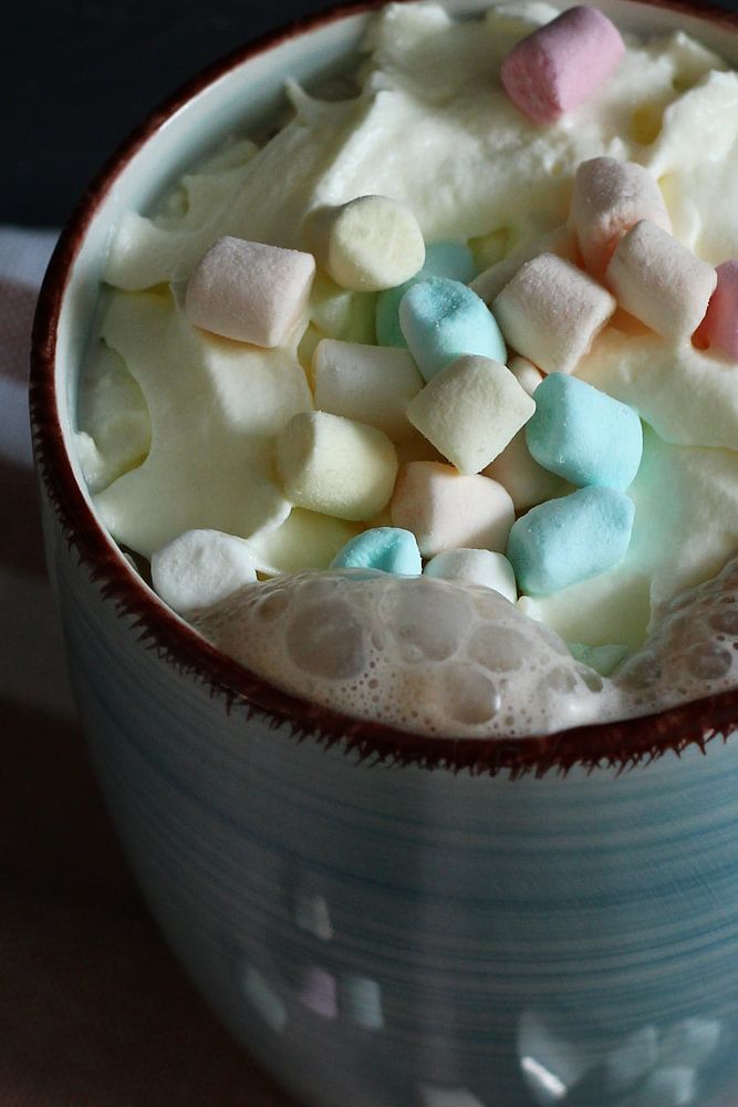 Wenn es draußen kalt ist, gemütlich drinnen auf der Couch unter einer Decke aus heißer Schokolade mit Schlagsahne und Marshmallows.