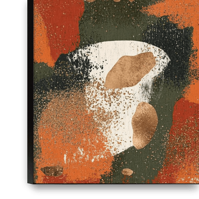 Dieses Design ist eine dynamische Mischung aus warmen, erdigen Tönen wie Terrakotta, tiefem Olivgrün und sanften Goldtönen. Der spielerische Einsatz abstrakter Formen und subtiler Texturen schafft einen rustikalen und doch modernen Look. Kräftige Pinselstriche und sich überlagernde Schichten sorgen für Tiefe, während die warmen Farben…