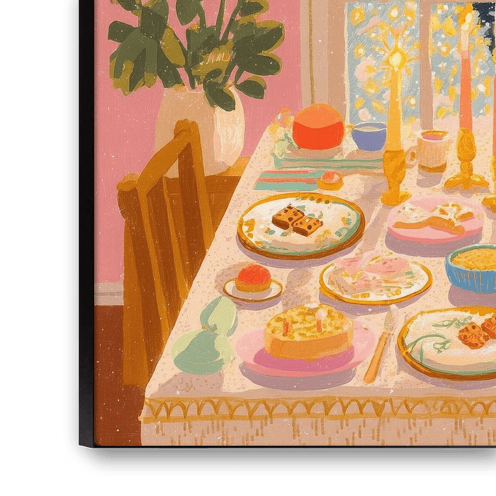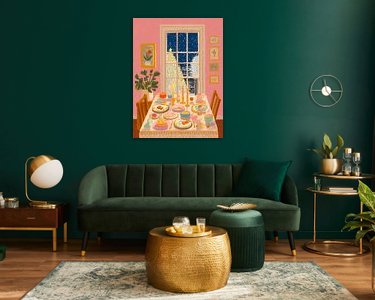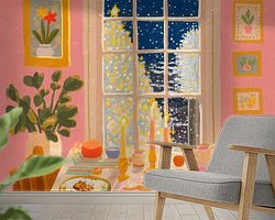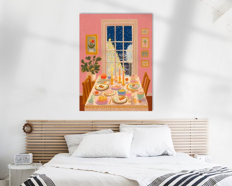 Diese Illustration strahlt Wärme, Gemütlichkeit und Heimeligkeit aus. An einem reich gedeckten Tisch mit buntem Geschirr, Teetassen und goldenen Kerzen kann man die Atmosphäre eines festlichen Winterabends spüren. Durch das Fenster leuchten draußen die Lichter eines Weihnachtsbaums, während sanfte Schneeflocken in die Nacht fallen. Die rosafarbenen Wände, die alten Gemälde und das dezente Kerzenlicht sorgen für eine verträumte und nostalgische Stimmung. Alles scheint für einen Moment stillzustehen, als ob die Welt draußen in einem stillen, schimmernden Winter verschwindet. Die Farben sind sanft, aber voller Leben - Rosa-, Gold-, Grün- und Blautöne fließen harmonisch ineinander. Jedes Detail erzählt eine Geschichte von Zweisamkeit, Wärme und kleinen Glücksmomenten. Dieses Werk fängt das Gefühl ein, während der Feiertage zu Hause zu sein: ein Tisch voller Liebe, Erinnerungen und dem einfachen Vergnügen, gemeinsam zu essen, während draußen der Schnee fällt.