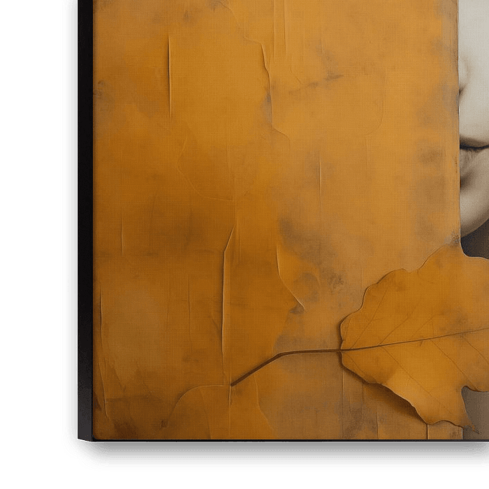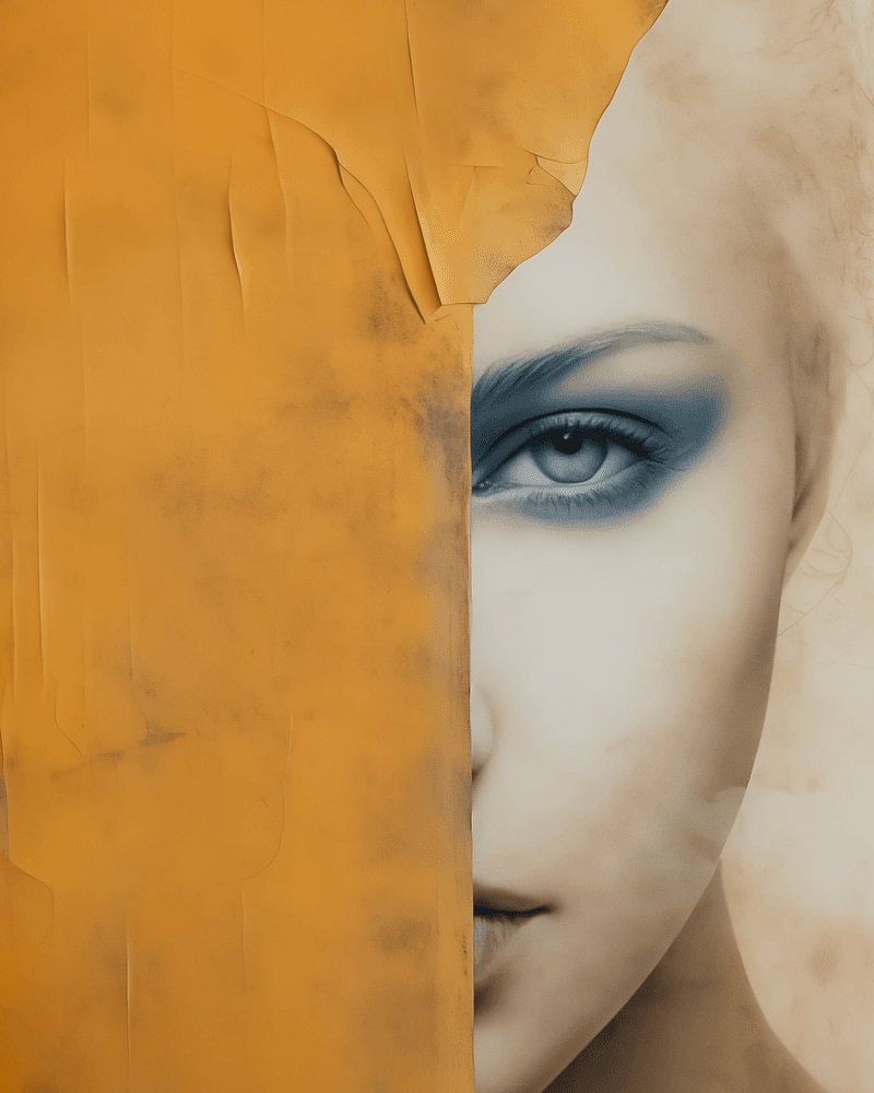 Modernes und abstraktes Porträt mit dem Titel: "Warten auf einen Altweibersommer". Das Gesicht der Frau ist halb hinter Herbstblättern und einem orange-goldenen Streifen verborgen.