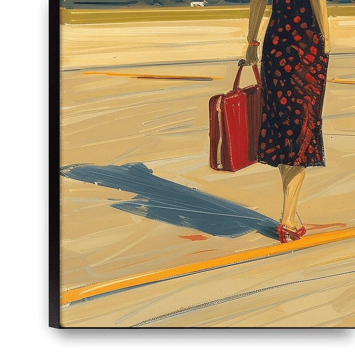 Eine Frau in einem schwarz-roten Kleid und mit einem eleganten Hut läuft allein mit ihrem Koffer auf dem Gelände eines Flughafens. Ihre Haltung wirkt ruhig und nachdenklich, als würde sie einen Moment innehalten, bevor sie ihre Reise antritt. Im Hintergrund erhebt sich ein markantes orangefarbenes Gebäude, dessen klare Linien im…