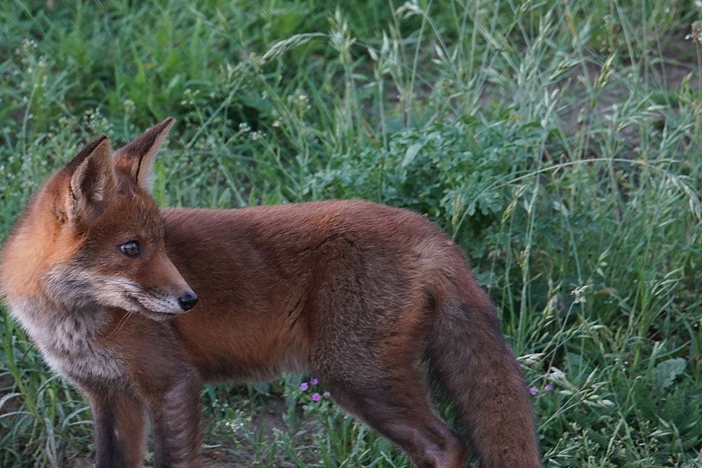Der junge Fuchs schaut neugierig hinter sich, was sich dort befindet. Er steht bei seinem Fuchsbau und erkundet die Welt.