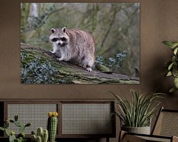 Wasbeer is aan het klimmen in een boom in aqua zoo friesland.