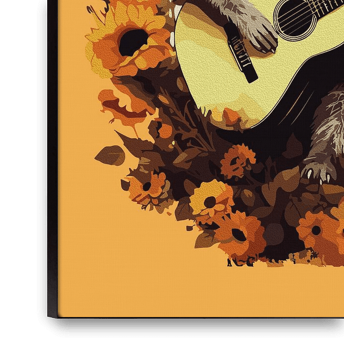 Bestelle dieses Popart-Wandbild Waschbär-Gitarren-Ständchen in Sonnenblumen von Ramy Salah Hefny als Reproduktion auf Leinwand, Alu-Dibond, als Poster, Fototapete oder Acrylglasbild.