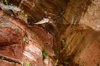 Wasser tropft durch die Ritzen an den Lower Emerald Pools im Zion National Park in Utah, USA. Es sieht nicht nach viel aus, aber wir sind bei unserem Spaziergang hier tatsächlich ziemlich nass geworden.