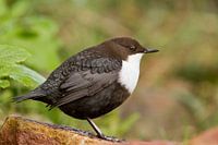 Eine Wasseramsel, die gerade aus dem Wasser gekommen ist und auf einem Stein sitzt