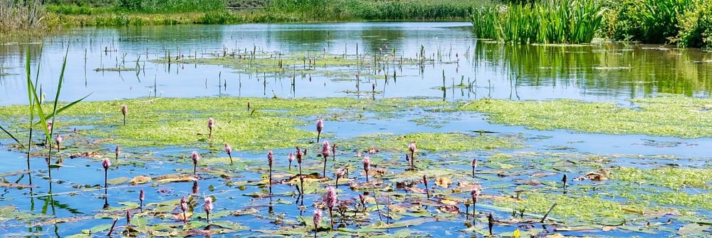 Ein Panoramablick vom Wassereinzugsgebiet Bakkum - Castricum PWN Noord-Holland. Eine Dünenlandschaft, das Dünenreservat NoordHollands. Im Vordergrund ist blühende Torfwurzel zu sehen, hier eine Wasserpflanze. Das Wasser ist sehr klar.