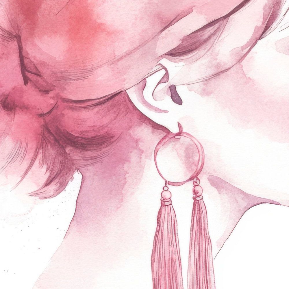 Das Bild zeigt eine stilisierte, feminine Silhouette in sanften Rosatönen. Der sanfte Wasserfarbhintergrund unterstreicht die Eleganz der abgebildeten Frau, deren feine Züge und geschmeidiges Haar harmonisch zur Geltung kommen. Besonders auffällig sind die langen, pendelnden Ohrringe, die dem Bild eine zusätzliche Note von Raffinesse verleihen.