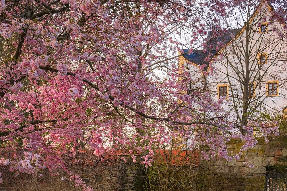 An einem Frühlingsabend spazierte ich um das Wasserschloss Klaffenbach. Der mit rosa Blüten verzierte Baum scheint das Schloss umarmen zu wollen.