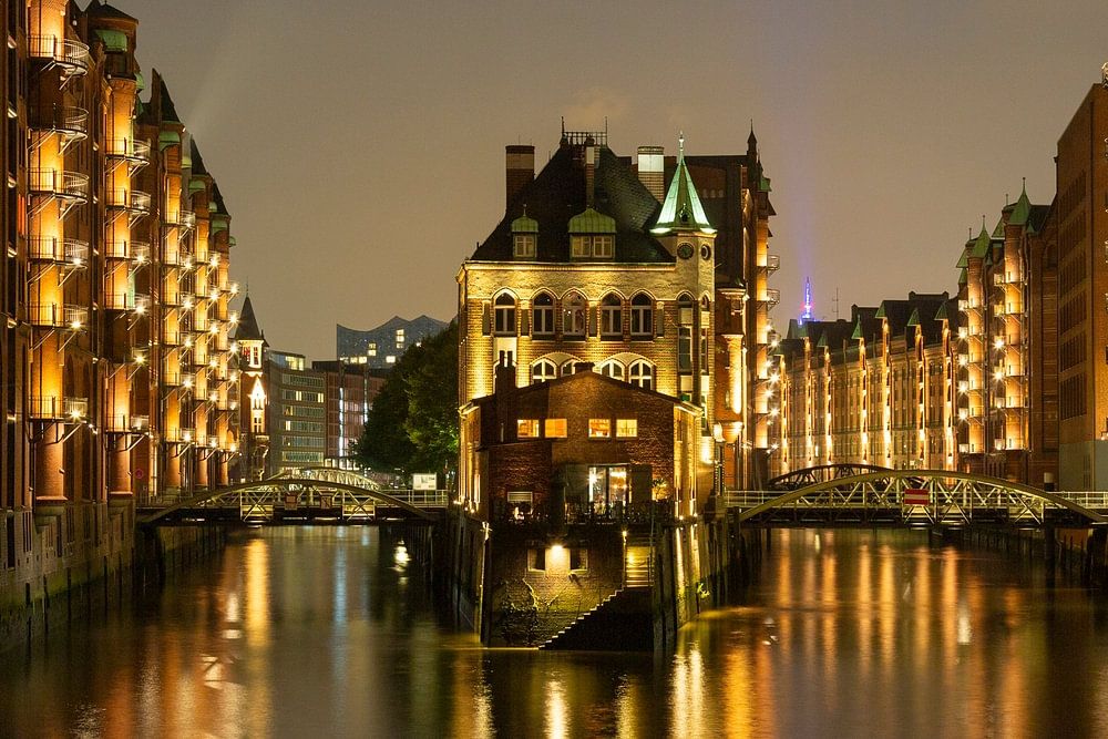 Blick auf das Wasserschloss am Abend, Speicherstadt, Hansestadt Hamburg, Deutschland