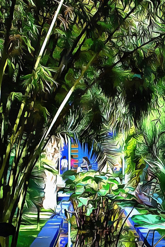 Ein Fotokunstbild von einem der vielen Wasserspiele im Jardin Majorelle in Marrakesch, Marokko. Dieses Wasserspiel hat die berühmte Farbe Majorelle-Blau und wird auf beiden Seiten von dem riesigen Bambus überragt, der in diesem botanischen Garten wächst.