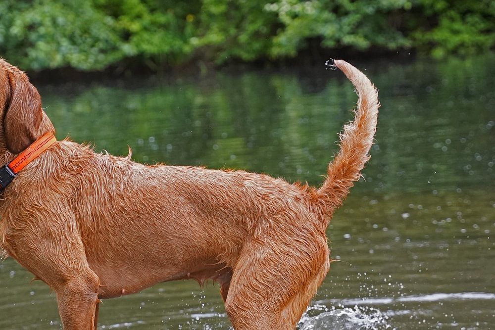 Wasserspiele am See mit einem braunen Magyar Vizsla Drahthaar.