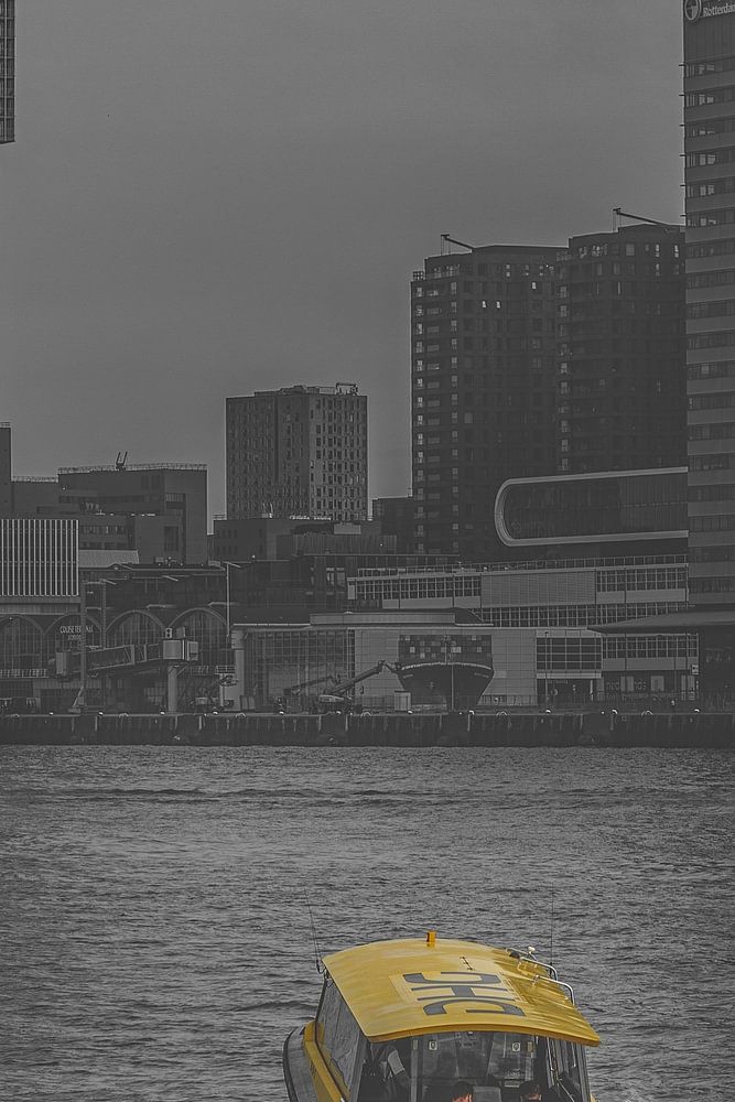Ein Wassertaxi fährt von der Westerkade zum Kop van Zuid in Rotterdam. Aufgenommen mit einer Canon EOS 5D mark III mit einem 24-105-mm-Objektiv. Das Foto wurde in Schwarz-Weiß aufgenommen (mit Ausnahme des Bootes), damit sich das gelbe Wassertaxi von der Skyline von Rotterdam abhebt.
