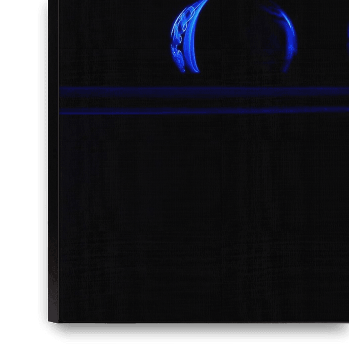 Bestelle dieses abstrakte Wandbild Wassertropfen mit Reflexion von blauem Rauch von Inge van den Brande als Reproduktion auf Leinwand, Alu-Dibond, als Poster, Fototapete oder Acrylglasbild.