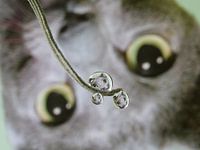 Dies ist ein Foto von drei Wassertropfen, in denen sich jeweils eine graue Katze spiegelt. Wassertropfen wirken wie eine Linse, die ein gestochen scharfes Bild des darunter liegenden Motivs einfängt, in diesem Fall eine graue Katze mit grünen Augen. Und wie eine Linse spiegelt ein Wassertropfen auch das Bild. Dadurch erhält das Foto…