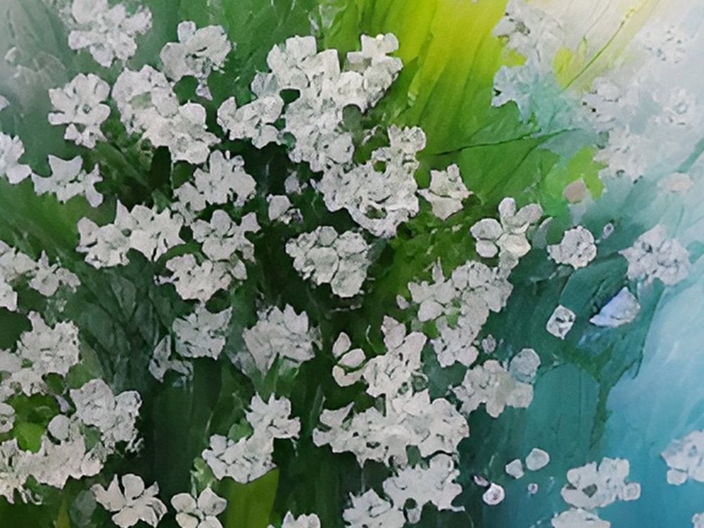 Ein Strauß kleiner weißer Blumen unter Wasser in einer digitalen Welt voller Farbe.