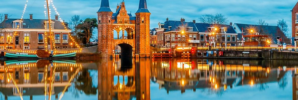Panoramablick über den Kolk auf die Schleuse von Sneek während der blauen Stunde. Fast kein Wind und daher eine schöne Spiegelung im Wasser.