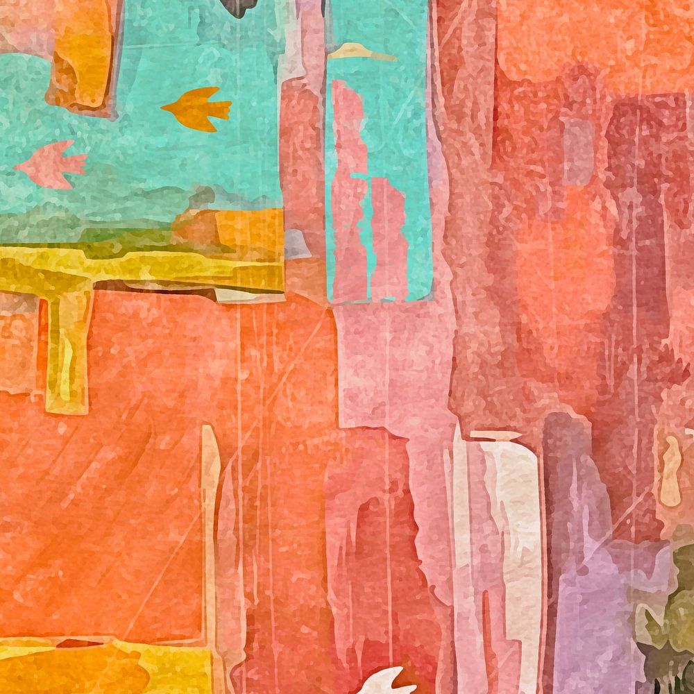 Eine moderne abstrakte Darstellung einer Stadt mit viel Wasser, Parks, Rasenflächen und weiten Feldern mit gelben, fliederfarbenen und rosa Wildblumen. Es ist Frühling und die Sonne geht langsam am Horizont auf. Einige Vögel fliegen über der Stadt. Die Stadt könnte man zu Recht als Großstadtdschungel bezeichnen. An manchen Stellen ist…