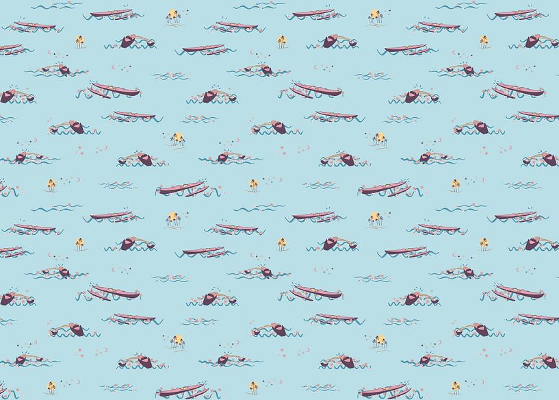 „Waving canoes“ ist eines der Designs aus meiner Kollektion „ 'When flowers meet the sea'. Het is een dessin in oorsprong en zou eventueel in andere kleuren gemaakt kunnen worden. De kano's zijn door mij getekend op basis van foto's“, die ich selbst in Hawaii entworfen habe.