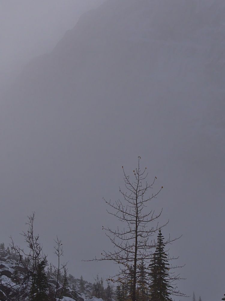 Ein Wanderweg zwischen Felsen verschwindet im dichten Nebel am Fuß des mächtigen Berges Mount Edith Cavell (3.363 m) in den Rocky Mountains im Jasper-Nationalpark, Alberta, Kanada.