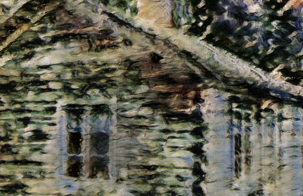 Eine rustikale Holzhütte ist inmitten eines Waldgebiets dargestellt, wobei Bäume und Laub die Sicht teilweise verdecken. Der impressionistische Stil vermittelt ein Gefühl des Alters und fügt die Struktur in die umgebende Natur ein.