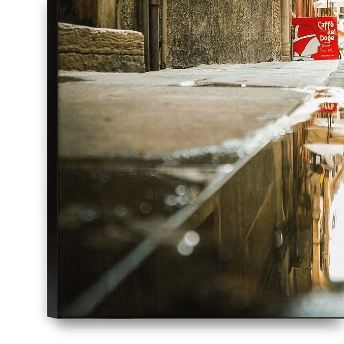 Links und rechts befinden sich graue Wände. Die Straße runter, ein verlassenes Café. Die Straße selbst scheint kein Ende zu haben. In der Ferne hört man das knisternde Geräusch eines alten Radios. Dann kehrt die ruhige Ruhe zurück. Die Zeit scheint stillzustehen, hier in der Altstadt von Venedig.....