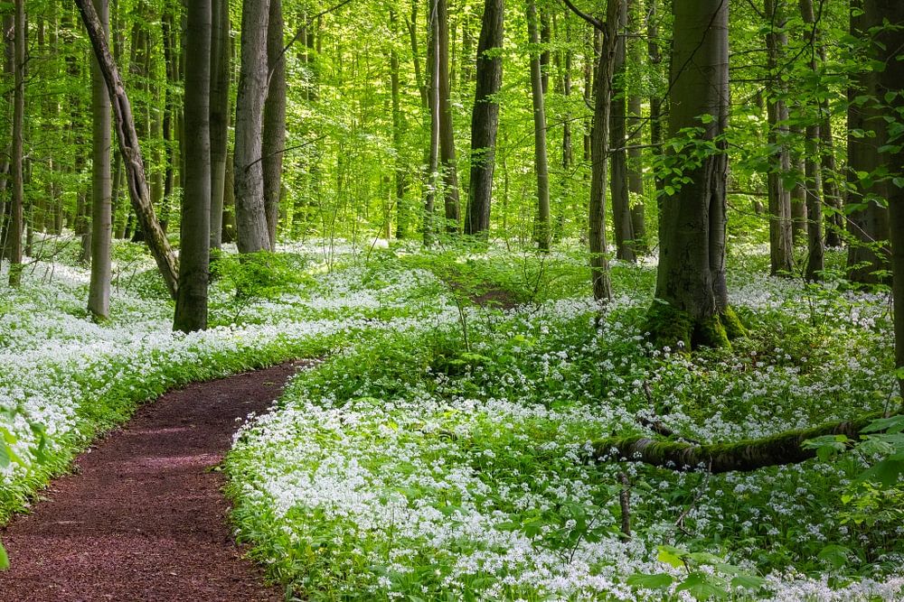 Ein von Bärlauch gesäumter Weg schlängelt sich durch den duftenden Frühlingswald.