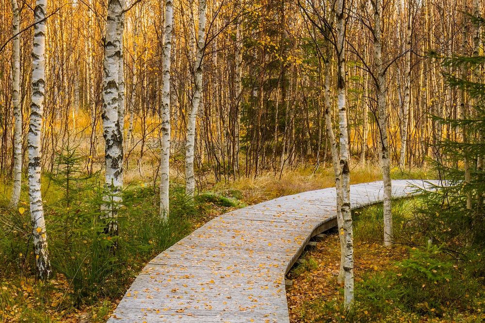 Ein Holzweg führt durch einen kleinen herbstlichen Birkenwald im Erzgebirge. Eine Farbkombination von Grün- und Gelbtönen.