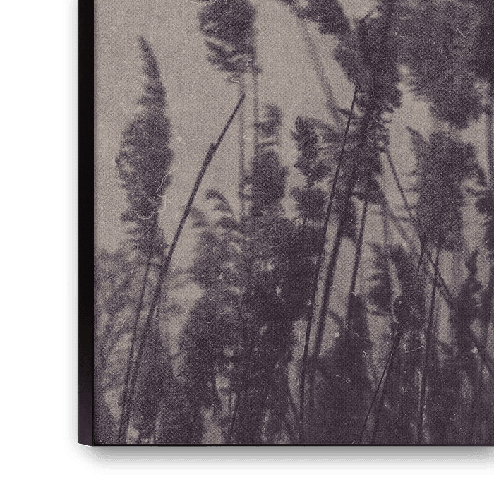 Ein Bild von Schilf, das sich sanft im Winterwind bewegt und eine heitere Atmosphäre unter dem Winterhimmel schafft. Dieses Mischtechnik-Kunstwerk hat dunkle Farbtöne und enthält subtile Texturen.