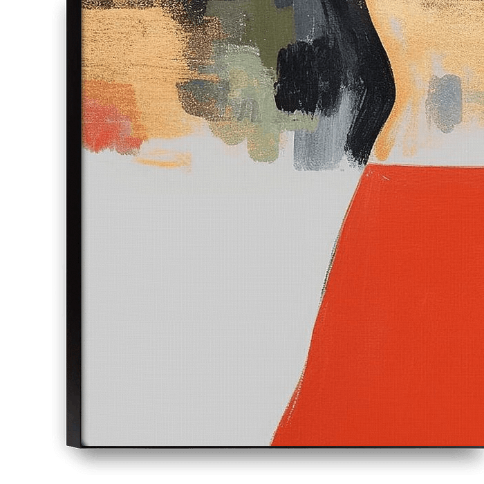 Weibliche Silhouette | ColorPlay - Dieses abstrakte Gemälde zeigt eine weibliche Silhouette mit einer verkleinerten, gesichtslosen Form, die in auffälligem Kontrast zu einem lebhaften Hintergrund aus abstrakten, farbenfrohen Elementen steht.