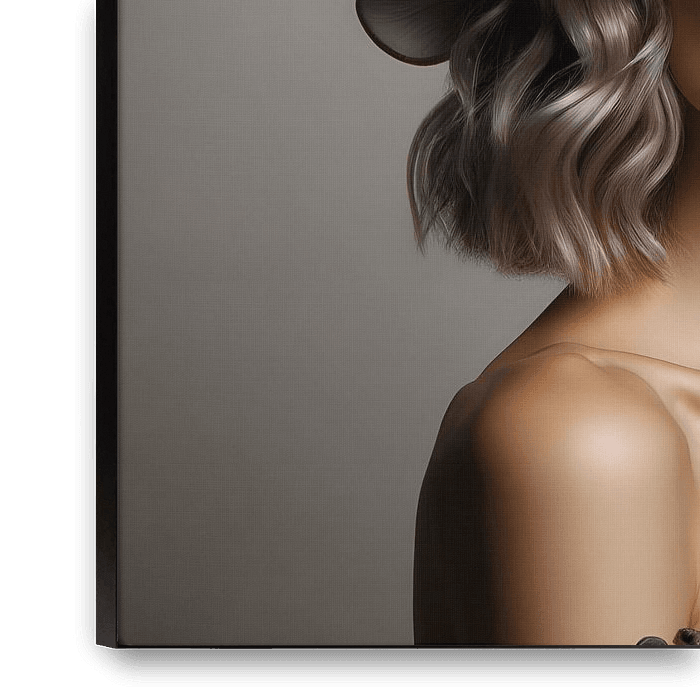 Bestelle dieses Porträt Weibliches Modell mit Hut aus Pilzen von Basahen als Reproduktion auf Leinwand, Alu-Dibond, als Poster, Fototapete oder Acrylglasbild.