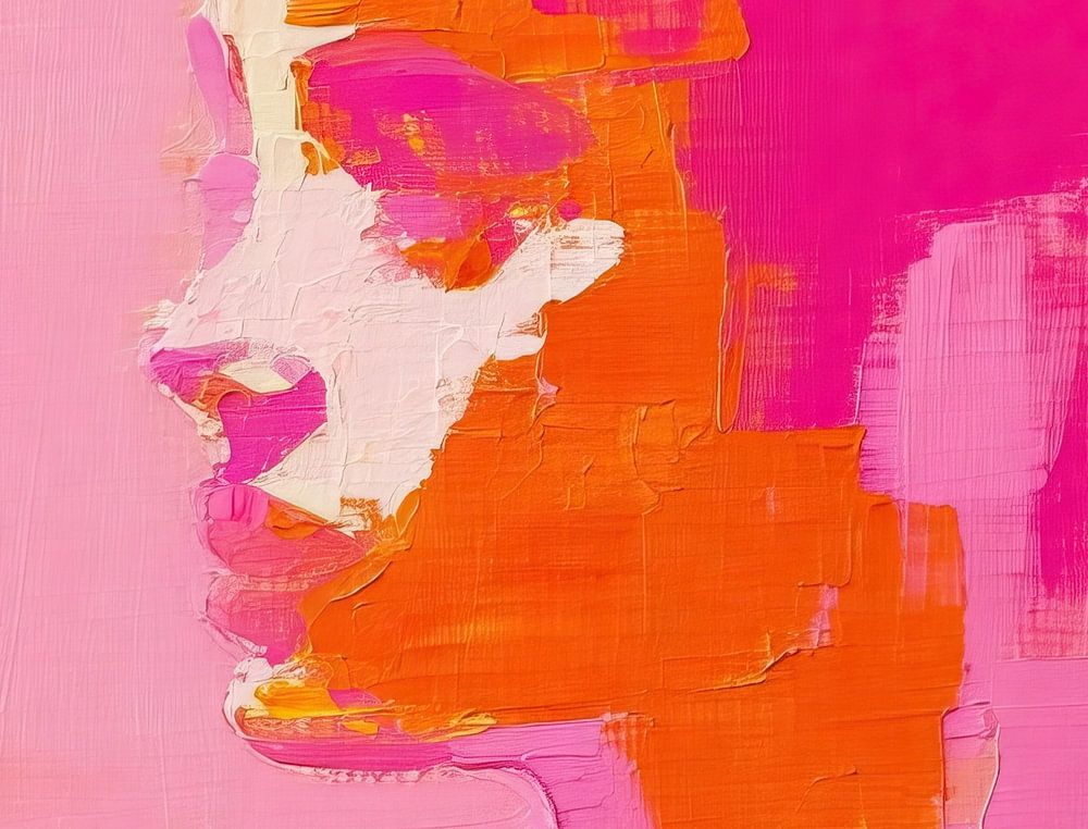Frauenporträt | Lebendiges Frauenporträt - Dieses abstrakte Frauenporträt zeigt die Seitenansicht einer Frau in leuchtenden Pink-, Orange- und Gelbtönen. Die Farben werden in lockeren, breiten Pinselstrichen aufgetragen, die die Konturen und Details ihres Gesichts formen.