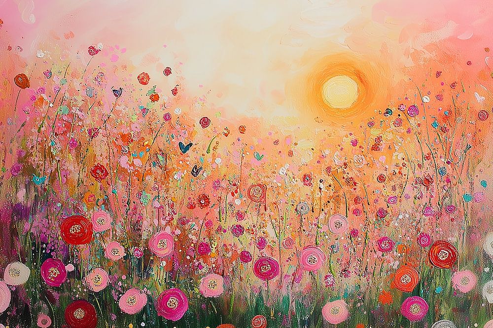 Flower Light ist ein Gemälde, das die Essenz des Lichts und der Blüte in einer warmen, einhüllenden Landschaft zusammenbringt. Die Leinwand wird von einem sanften, strahlenden Leuchten beherrscht, das aus dem Hintergrund aufsteigt. Die Sonne ist nicht scharf umrissen, sondern erscheint als heller Kern aus Weiß und Gelb, umgeben von…