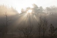 An einem ruhigen Morgen bricht das Sonnenlicht sanft durch den Dunst in den Niedermooren von Oisterwijk. Der Wald ruht noch, während die sanften Strahlen ihren Weg zwischen den Bäumen finden. Der Nebel dämpft Formen und Farben und verleiht dem Licht eine fast greifbare Präsenz.