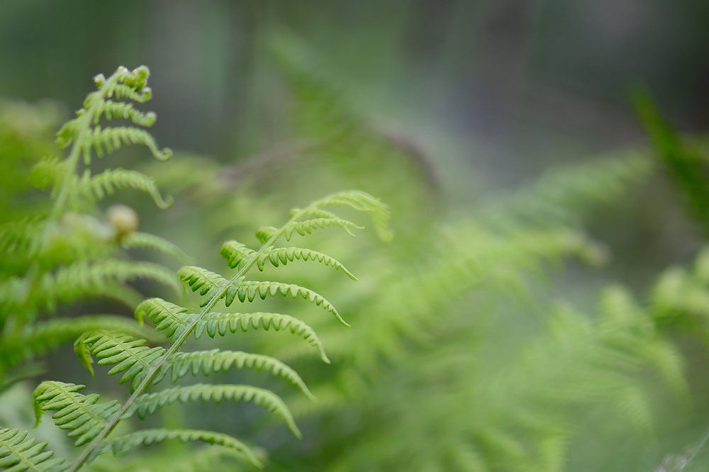 Nahaufnahme eines Feldes voller Farne, mit der dumpfen Waldvegetation im Hintergrund