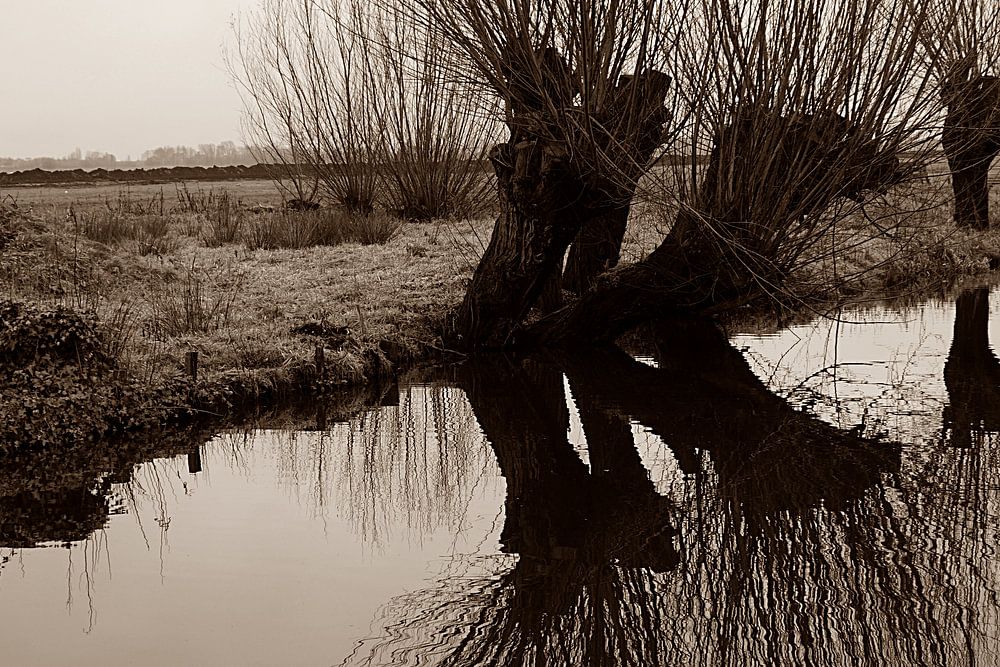 Bei windstillem Wetter sind die Poldersperren wie Spiegel, in denen sich die Kopfweiden spiegeln.