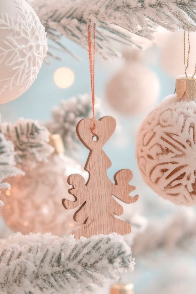 Ein zauberhafter Anblick, der Herzen höherschlagen lässt: Zarte, weiße Kugeln und liebevoll gestaltete Holzornamente schmücken die Äste eines frisch geschmückten Weihnachtsbaums. Das sanfte Licht sorgt für eine festliche Atmosphäre. Perfekt für das Wohnzimmer, wo die Familie zusammenkommt und die Magie der Weihnachtszeit spürt.
