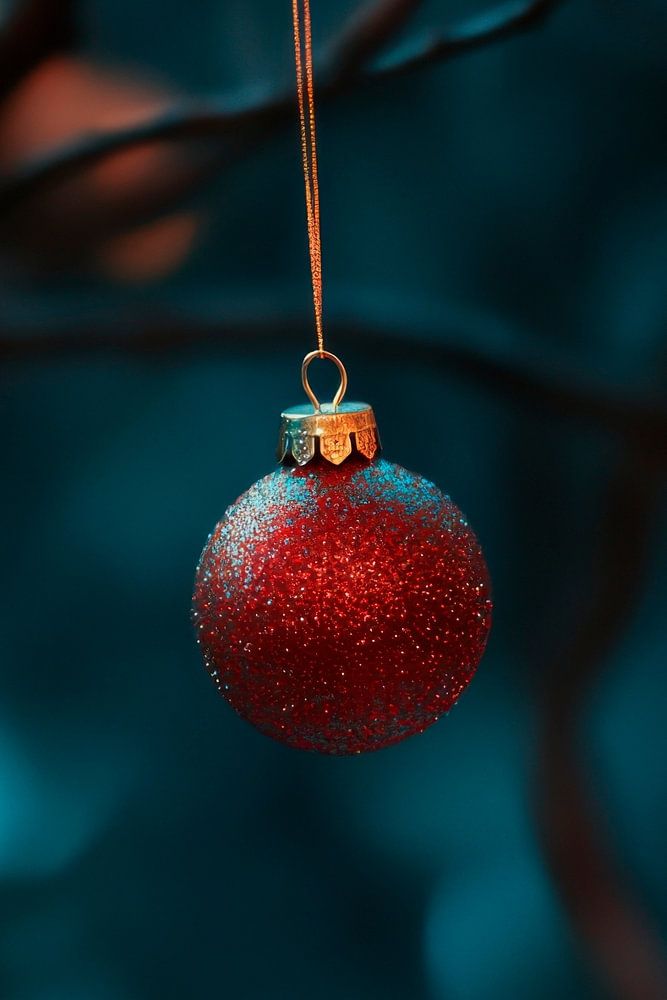 Ein funkelnder roter Weihnachtsbaumanhänger hängt schwebend an einem subtilen Ast, umgeben von warmem Lichterglanz. Die Szene strahlt eine magische, festliche Stimmung aus und lädt dazu ein, in Erinnerungen an besinnliche Feiertage einzutauchen. Ideal für das Wohnzimmer, um gemütliche Abende und festliche Vorfreude zu zaubern.
