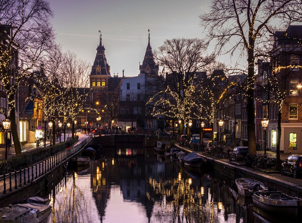 Die Spiegelgracht mit dem Rijksmuseum in Weihnachtsbeleuchtung, Amsterdam, Niederlande. Die Spiegelgracht ist in der Weihnachtszeit die am schönsten geschmückte Gracht.
