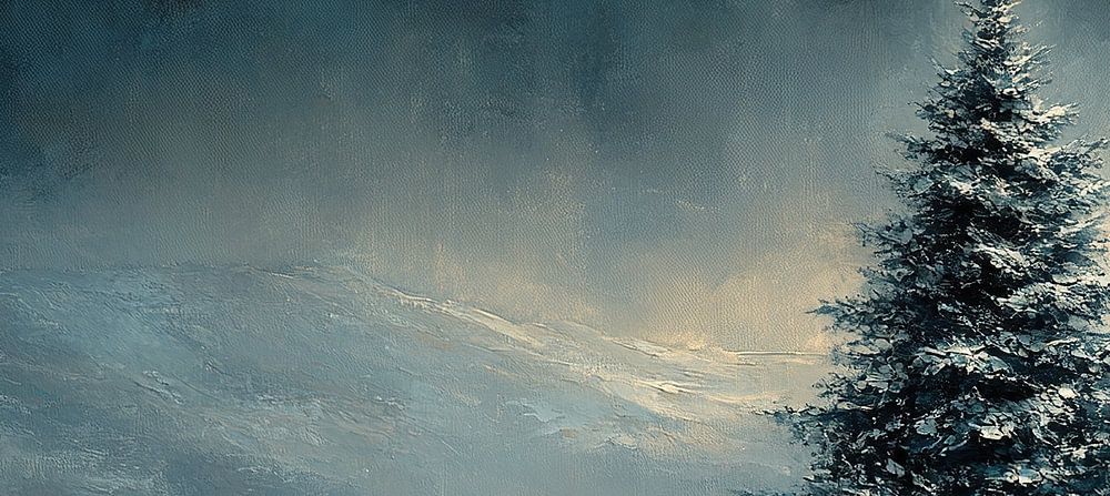 Weihnachtsbaum - Dieses winterliche Landschaftsgemälde zeigt einen majestätischen, mit einem leuchtenden Stern geschmückten Weihnachtsbaum, umgeben von einem sanft verschneiten Feld unter einem tiefblauen, geheimnisvollen Nachthimmel, der ein Gefühl von Ruhe und festlicher Gelassenheit ausstrahlt.