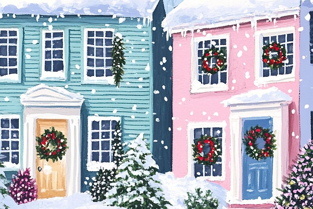 Christmas Houses | Winter Wonderland - Dieses weihnachtliche Gemälde zeigt eine stimmungsvolle, verschneite Straße mit bunten, mit Weihnachtskränzen und Lichtern geschmückten Häusern, umgeben von Weihnachtsbäumen bei leichtem Schneefall.