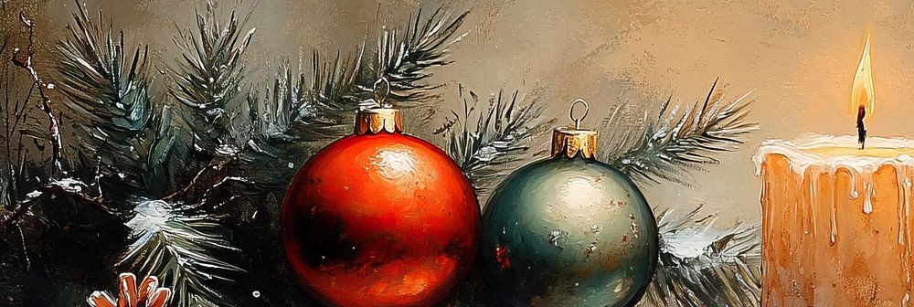 Weihnachtskerze - Dieses Weihnachtsbild zeigt eine stimmungsvolle Komposition aus roten und grünen Kugeln mit einer brennenden Kerze und schneebedeckten Tannenzapfen und Zweigen, die zusammen die Wärme und Gemütlichkeit der Weihnachtszeit ausstrahlen.
