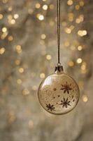Dieses raffinierte Weihnachtsbild zeigt eine transparente, mit goldenen Schneeflocken und funkelnden Punkten verzierte Glaskugel, die vor einem Hintergrund voller warmer Lichtflecken zu schweben scheint. Die zarte Kette und das subtile Farbspiel unterstreichen die Eleganz des Ornaments, während der Bokeh-Hintergrund eine magische…