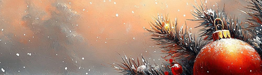 Weihnachtskugeln | Verschneite Tannen mit Weihnachtskugeln - Dieses Weihnachtsgemälde zeigt eine stimmungsvolle Winterszene mit dem Schwerpunkt auf zwei leuchtend roten Kugeln, umgeben von verschneiten Tannen und sanften Winterlichtern, die Wärme und Farbe in einer ruhigen, kühlen Landschaft verbreiten.