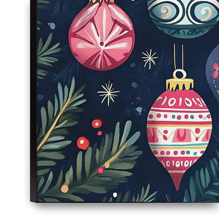 Weihnachtskugeln - Dieses Weihnachtsbild zeigt bunte Kugeln mit verschiedenen Mustern, die zwischen grünen Tannenzweigen und roten Beeren auf einem dunklen Hintergrund hängen, gemalt in einem modernen Malstil.