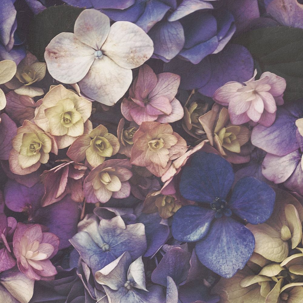 Verschiedene blühende Hortensien, lila, blau, limonenfarben, alle blühen um die Weihnachtszeit in Neuseeland.