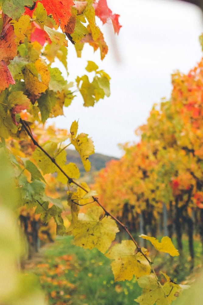 Das Foto zeigt einen Weinberg im Herbst mit allen möglichen Farben der Blätter.